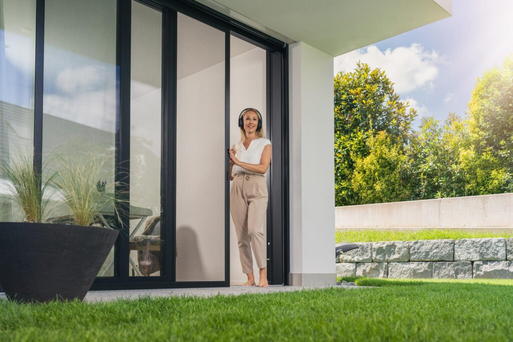 Mit einer Handbewegung ist das Türrollo einsatzbereit und verschwindet bei Nichtgebrauch im Rollokasten. Windschutzbürsten sichern das Gewebe bei Wind, während eine Federbremse sanftes und leises Aufrollen ermöglicht.